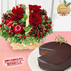 写真は、赤バラのウッドバスケットと魅惑のザッハトルテ(Xmasオーナメント付)です。